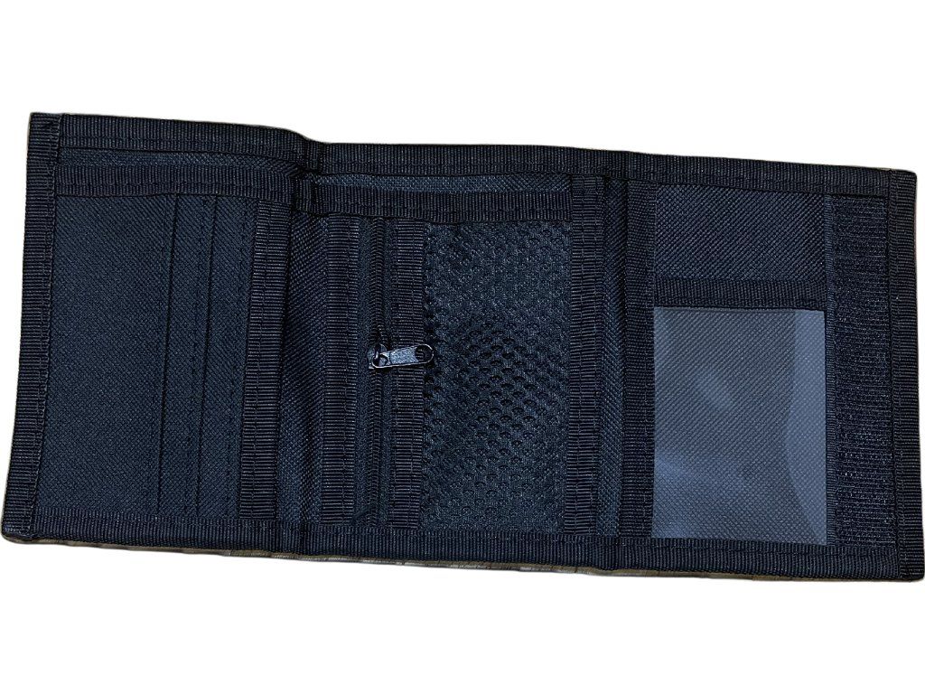 Peněženka je na suchý zip, má jednu přihrádku na papírové peníze, malé přihrádky na doklady a kapsičky na mince uzavíratelné na zip.