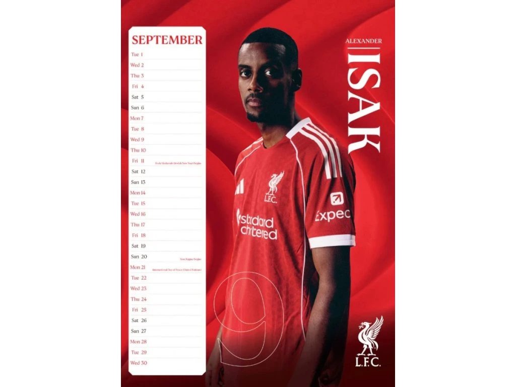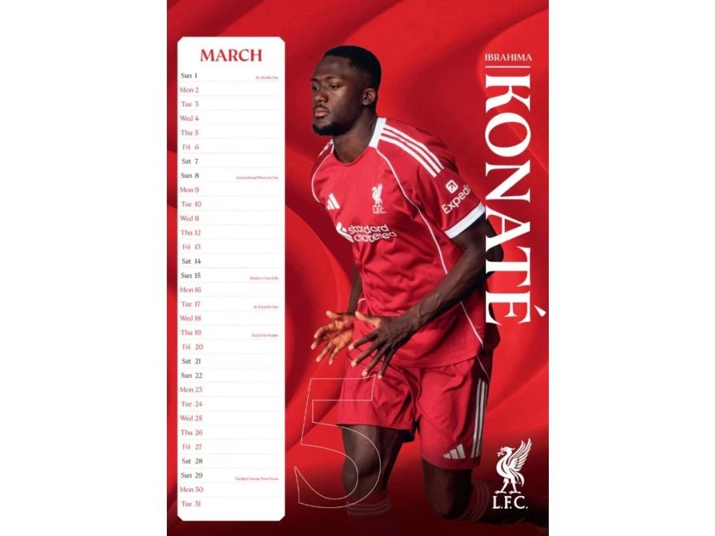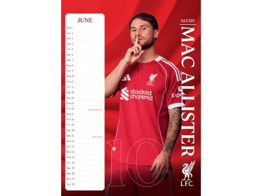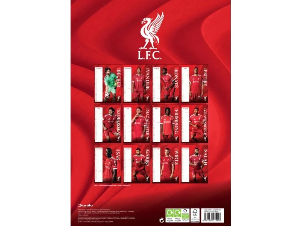 Oficiální produkt - dvanáctiměsíční nástěnný kalendář na rok 2026 s licencí britského fotbalového klubu FC Liverpool.