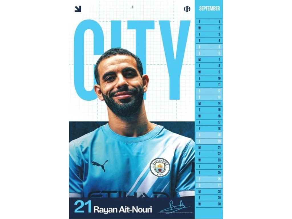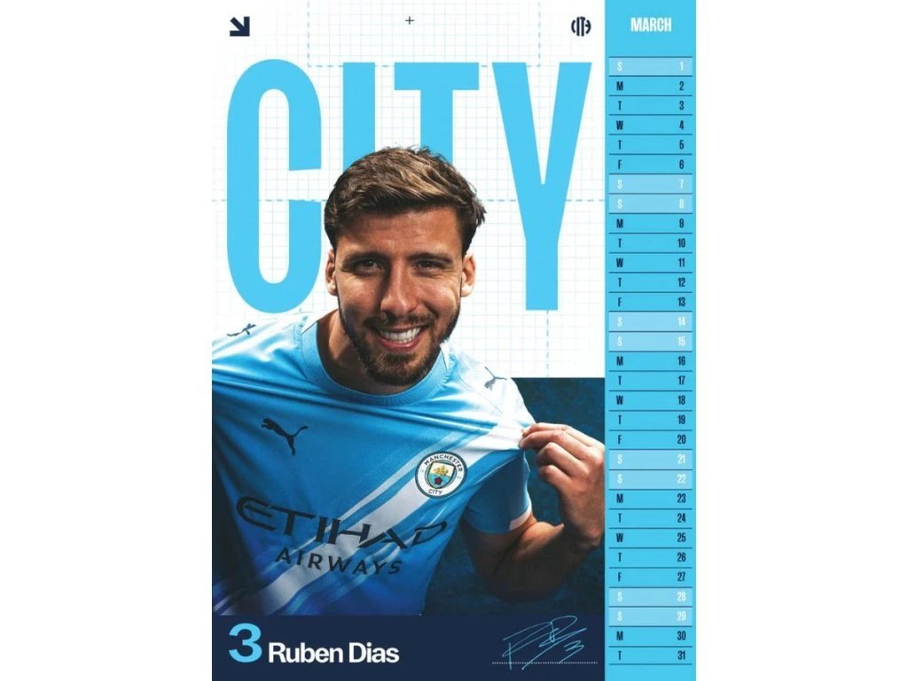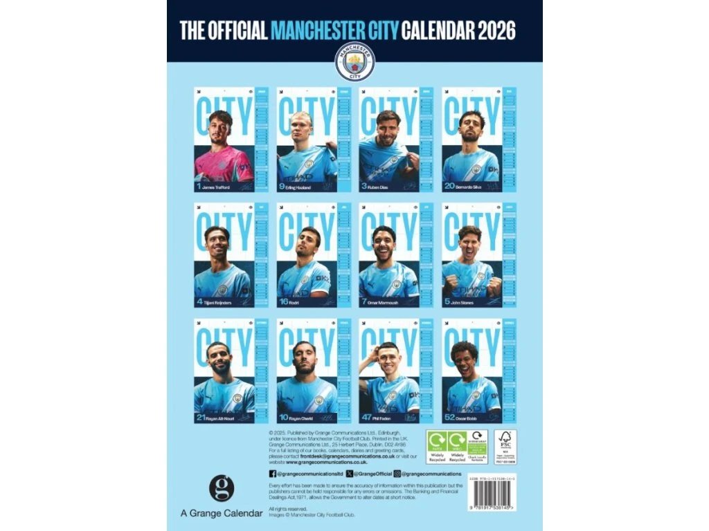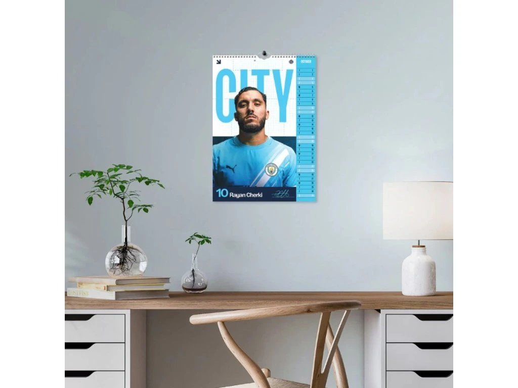 Oficiální produkt - dvanáctiměsíční nástěnný kalendář na rok 2026 s licencí britského fotbalového klubu FC Manchester City.