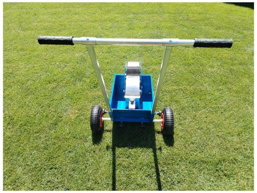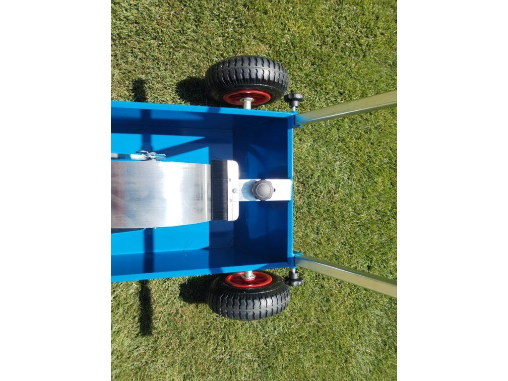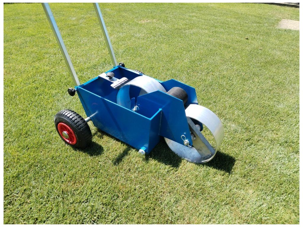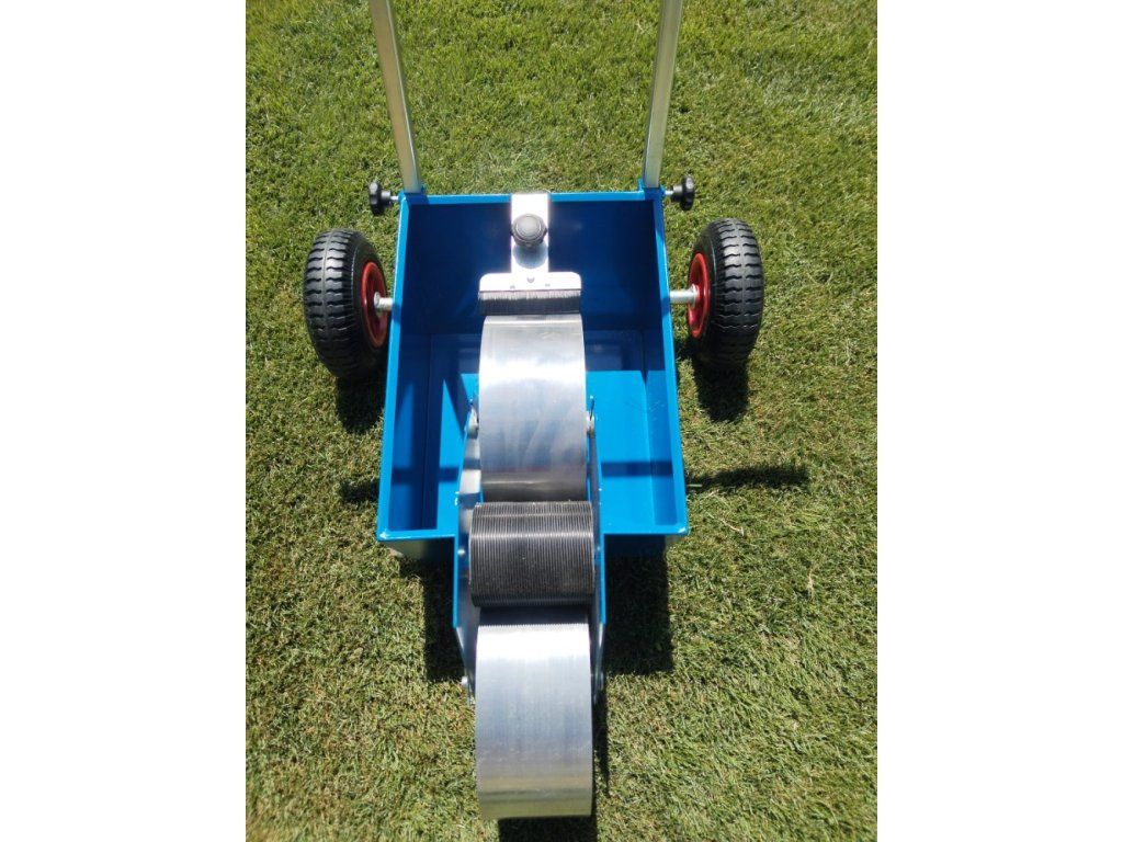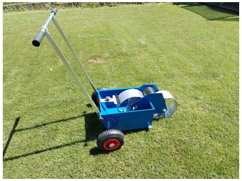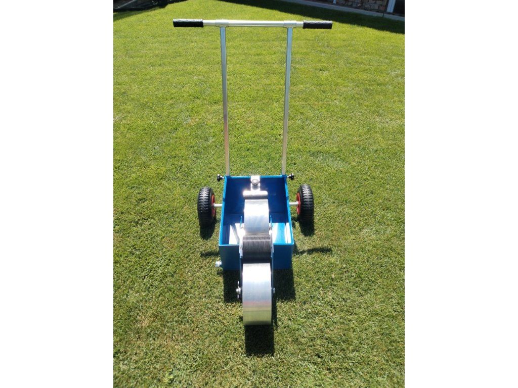 Návod a údržba : Po vyjmutí z krabice nasadíme kola a zajistíme proti vysunutí kovovými zátkami, které narazíme na hřídele. Do předního držáku, po vyjmutí čepu, nasadíme hliníkové kolo a čep zasuneme zpět, druhé hliníkové kolo je již vložené na vidlice v nádobě lajnovačky. Nasadíme menší přenosové kolo mezi kola hliníková a vymezíme boční vůli šrouby. Do středního kola pro lepší zatížení nasypeme libovolný sypký materiál. Kartáčkem regulujeme sytost lajny. Smontujeme a nasadíme držadlo. Nalijeme náplň – tekuté vápno nebo latex, doporučujeme přidat malířskou bělobu. Po použití řádně vystříkáme nádrž vodou a občas namažeme kluzné plochy.